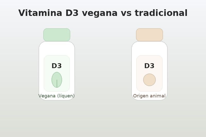 - Existen suplementos de vitamina D3 vegana obtenida de líquenes, que contienen colecalciferol químicamente idéntico al D3 de origen animal (ProAge, 2022; Alternatur, 2024).alternatur.es+1